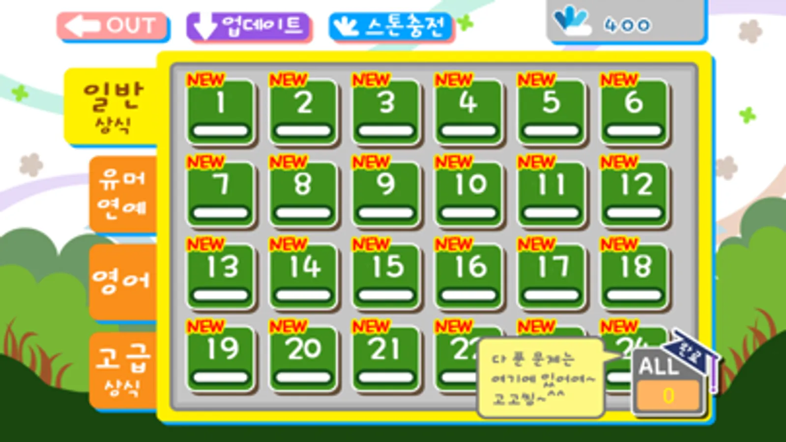 일반상식/유머연예/영어/고급상식 4가지 카테고리의 원하는 문제를 선택해보세요