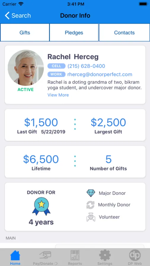 ▶ Be More Prepared - No more binders and folders! Review pledges, pledge balances and gift history for each donor and view their address on a map. Or dive deeper in our powerful suite of data-rich reports made for mobile users.