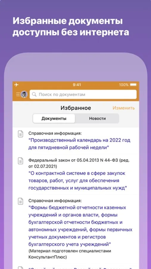 Для работы без доступа в интернет можно заранее поставить закладки на любой документ или его часть, так что нужный кодекс или закон всегда будут под рукой. Документы с закладками сохраняются в разделе «Избранное».
