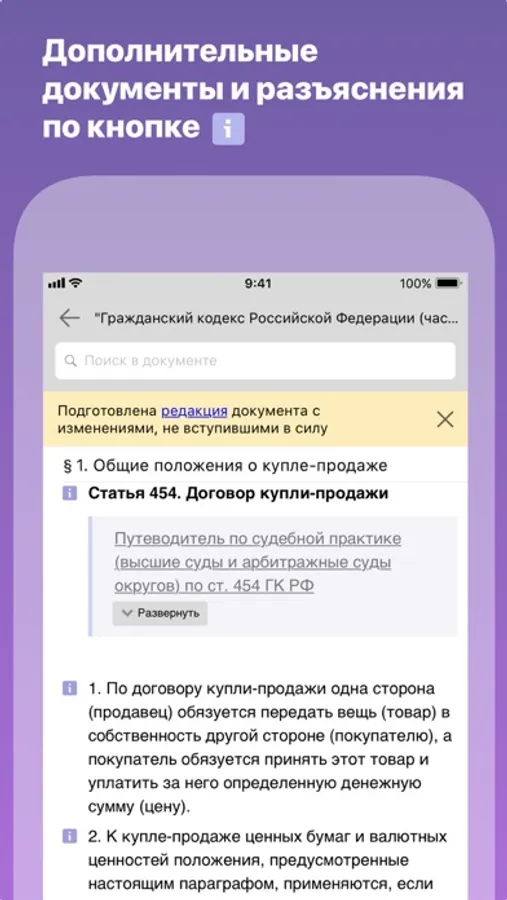 Расширенный поиск поможет найти документы по известным реквизитам (дата принятия НПА, принявший орган, вид документа: закон, проект, постановление и пр.). Доступны тексты в любой редакции, даже c изменениями, не вступившими в силу. При помощи кнопки i на полях можно получить разъяснения (дополнительные документы) к абзацу или статье документа.
