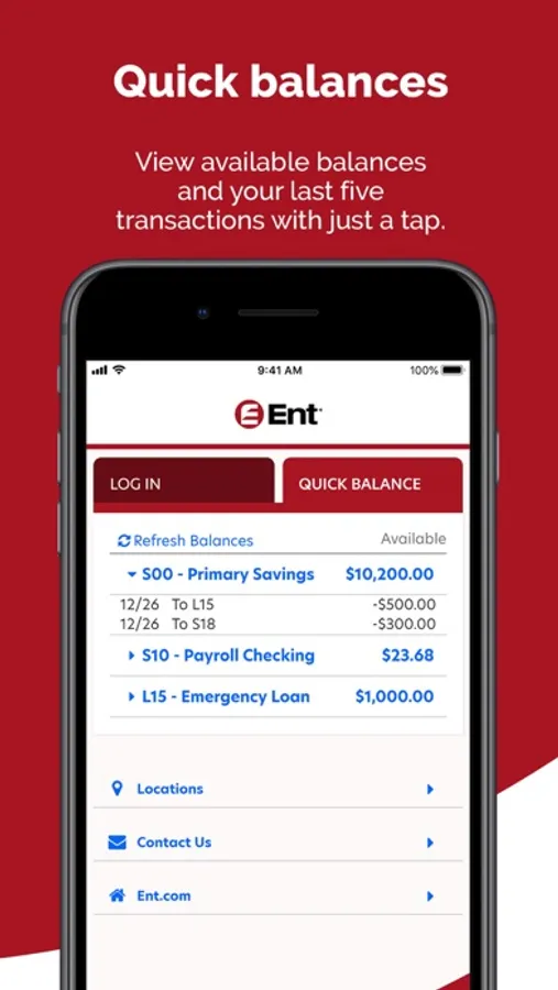 Your personal financial information security is our top priority. Ent uses advanced encryption technology to safeguard your information, and no account information is stored on your device. For more information on how Ent protects your personal financial information, visit Ent.com.