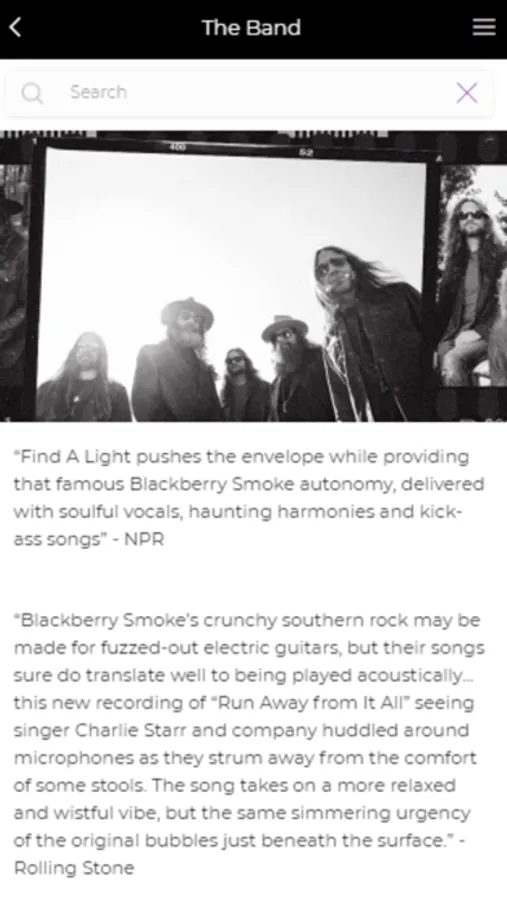 The Official Blackberry Smoke Application. This exclusive app will keep fans up to date with Blackberry Smoke's ever changing Touring Schedule, New Releases and Exclusive Content.