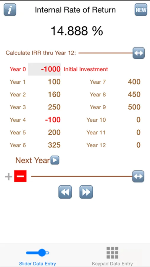 Internal rate of return can be computed over 1 to 12 years for the quick slider input option and over 1 to 20 years for the extended keypad input option.