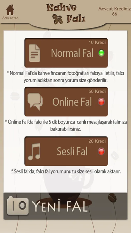 Uygulamayı indirmek ücretsizdir. Her fal baktırdığızda hediye krediler kazanabilirsiniz. Facebook ve twitter baglantisi yapıp hediye kredileri ikiye katlayabilirsiniz. 100 kredi alarak bir falı 1,89 $ getirebilirsiniz.