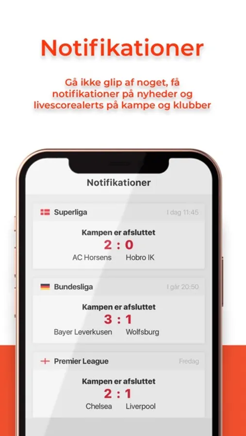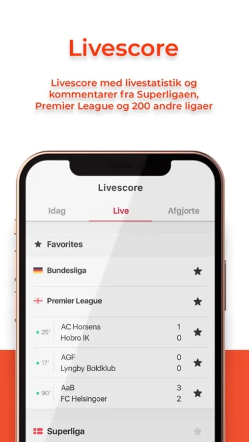 Derudover får du livescore fra alle vigtige fodbold ligaer. Du kan sætte overvågning på alle fodboldkampe eller dine favoritklubber, hvorefter du modtager automatisk besked ved kamp start, mål, røde kort m.m.