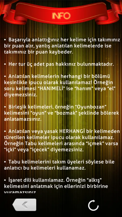 Seçilen kategorilerin özelliklerine ve kurallarına uygun olarak karşınıza çıkan kelimeler, belirli bir süre dahilinde diğer katılımcılara anlatılmaya çalışılır.