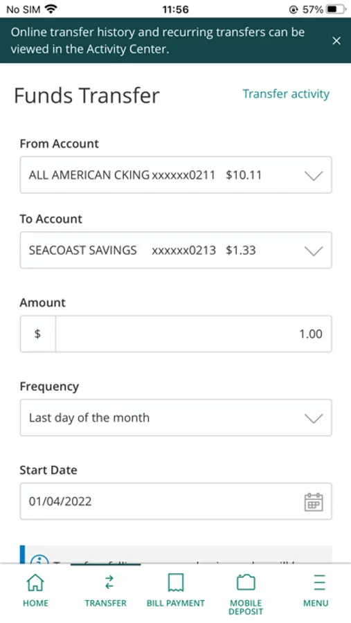 ⁻ Transfer funds to other accounts owned by you or to another Seacoast customer