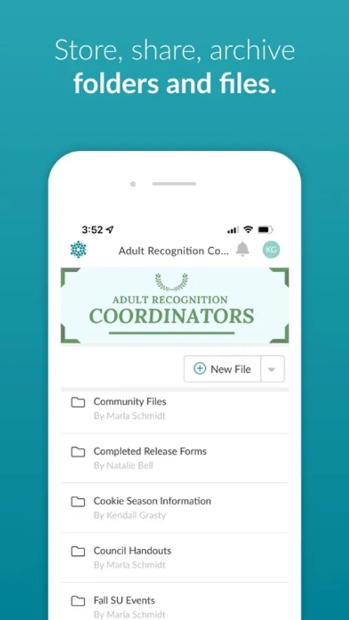 Files & Folders: Archive and share files and folders by group. Nest files into folders.