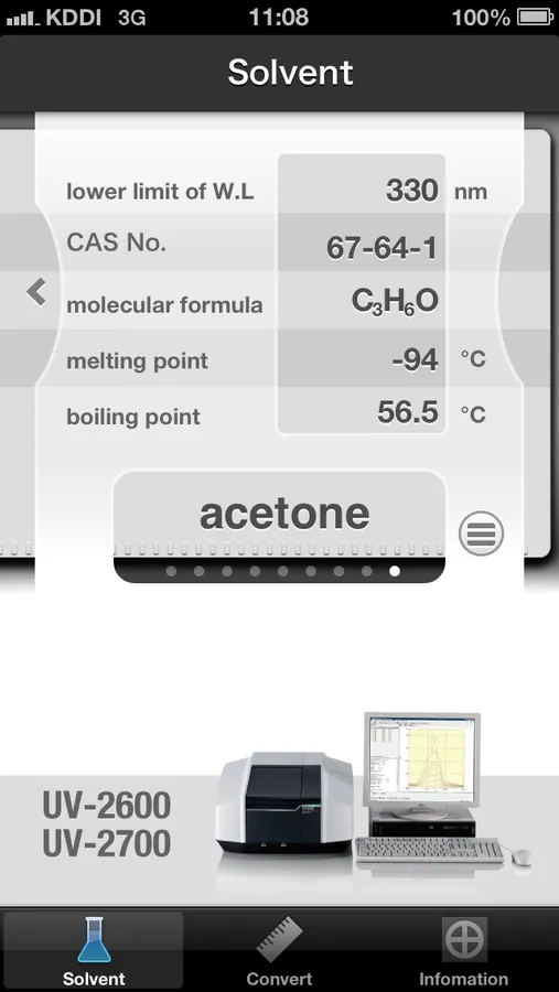 You can view solvent characteristics which include the lower limit of useable wavelength, melting point and boiling point values, etc. for each solvent. Solvents can be easily chosen by scrolling through a list with the flick of the finger.