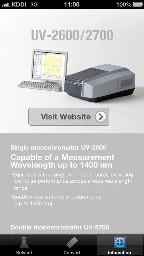 SHIMADZU UV is a handy iPhone application tool for users of UV-Vis Spectrophotometers and allows users to check the chemical and physical characteristics of solvents quickly. Converter is a convenient application for the unit conversion such as wavelength to wavenumber.