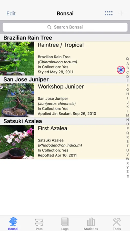 Bonsai Album makes keeping track of your Bonsai or Penjing collection easy. Track development of your trees throughout their lives, on your iPhone, iPad, or iPod touch!