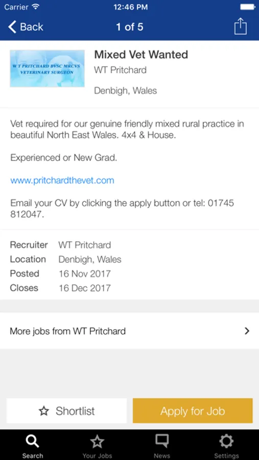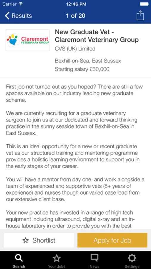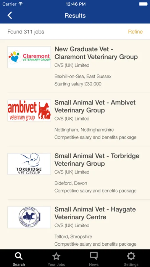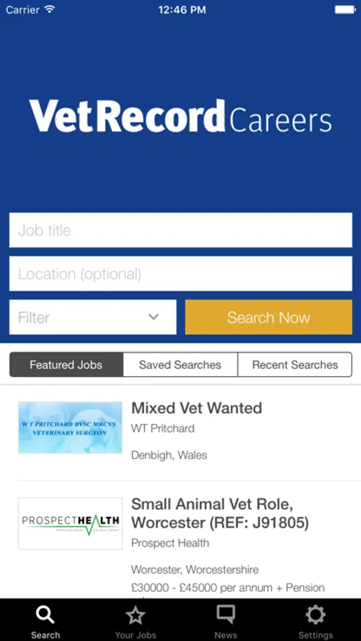 You can search across all veterinary categories, specialties, roles and regions. The app will remember which searches you made and you can also save your favourite searches and set an alert against them so you'll be notified of when that dream job comes in.