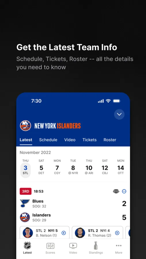 • Stay up to date with every team’s scores, schedules, standings, videos, and rosters
