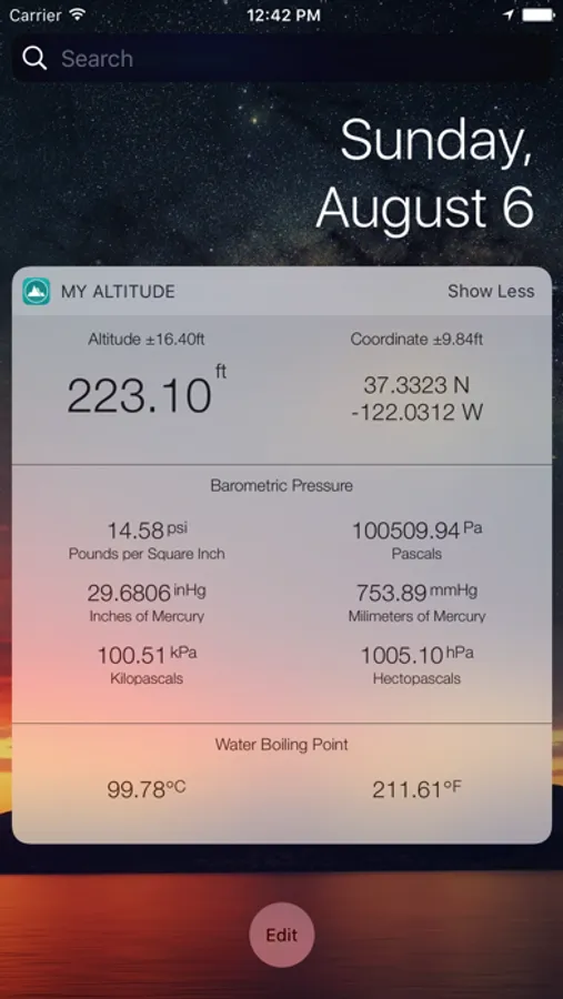 My Altitude uses GPS signals to determine your current location, showing your latitude, longitude and altitude (height from sea level) barometric pressure and water boiling point.
