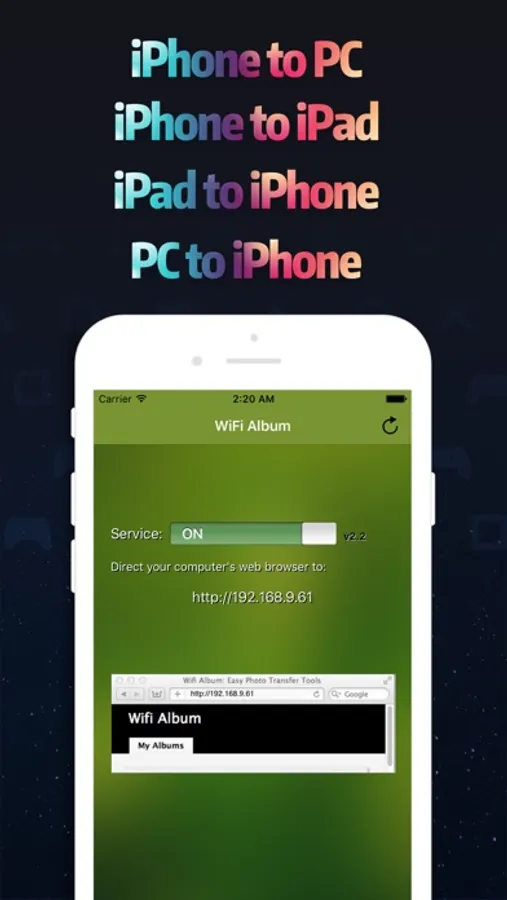 1 Run Wifi Album in your iOS devices, such as your iPhone and iPad, the screen display should show "Direct your computer's web browser to: http://xxx.xxx.xxx.xxx:8080", this mean you