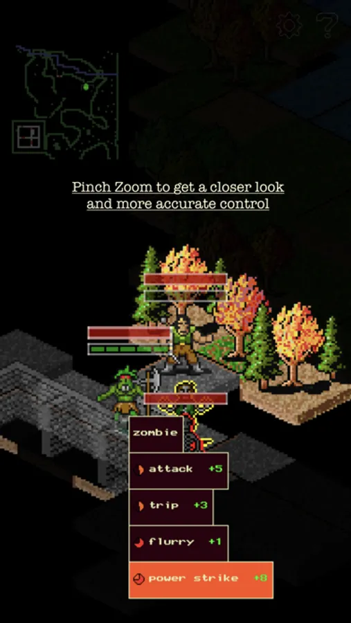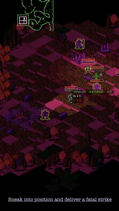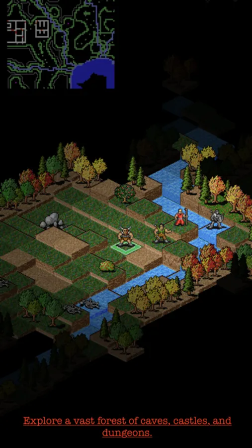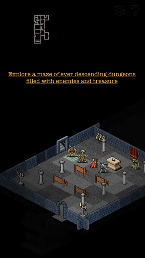 A minimal touch interface controls a party of adventurers in a turn-based adventure set in a procedurally generated open world filled with monsters and treasure.