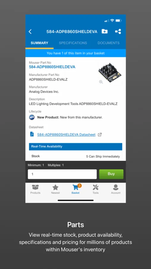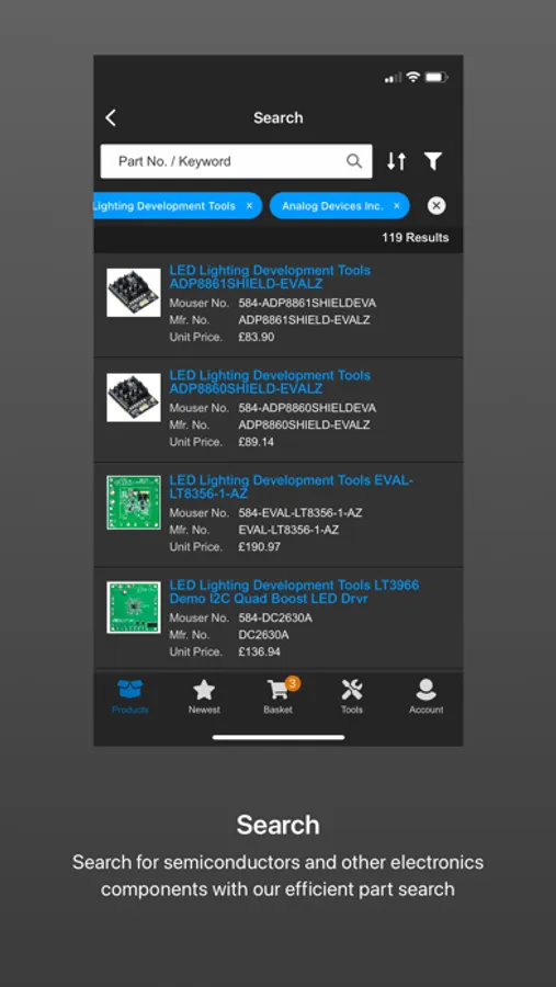 The Mouser app allows you to easily access the newest semiconductors and electronic components for your designs. Easily browse the newest products by date, category or manufacturer. Find products and view stock availability through a user-friendly search or built-in barcode scanner with the ability to build a shopping basket or project to checkout online.