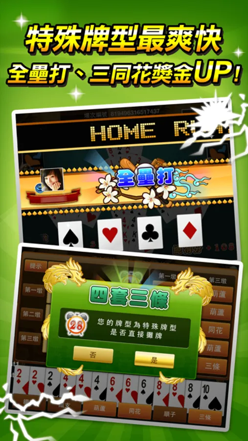 。 首創特殊牌型:三同花、三順子、湊一色,獎金UP!