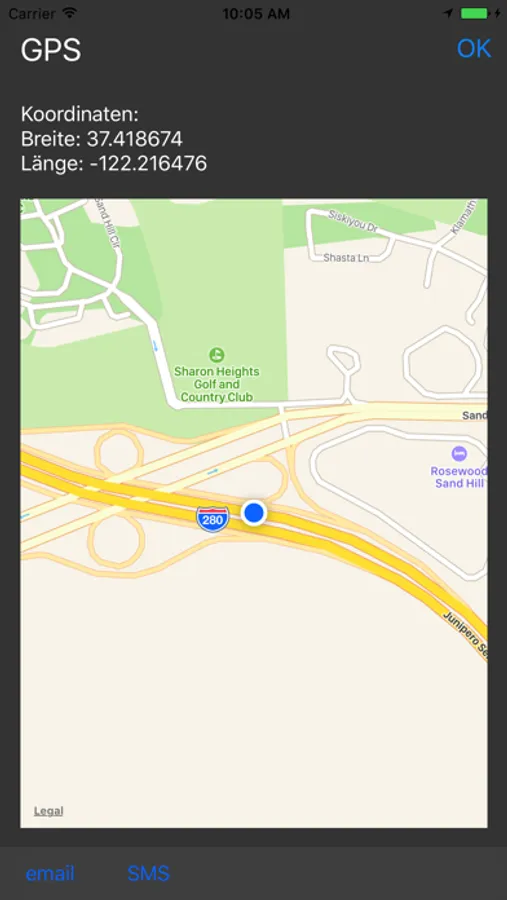 Hier wird ihnen die aktuelle GPS Position als Koordinaten und auf einer Karte angezeigt. Mit Hilfe der Tasten 'eMail' und 'SMS' können Sie die Position an andere Personen übermitteln. Die SMS Nummer tragen Sie in den Einstellungen ein.