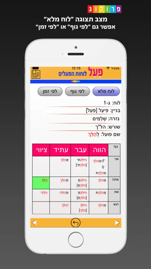 Verb tables are an important and essential tool for properly learning the basics of the Hebrew language. A considerable number of verb tables have been published to date, however we believe that this application offers users a more sophisticated and modern approach. Firstly, the objective was to create a unique high quality product for learners of Hebrew who wish to improve their understanding of verb conjugation. The many grammatical and visual features of this application are designed not only to provide a user-friendly interface but also to serve as an integral and effective educational tool.