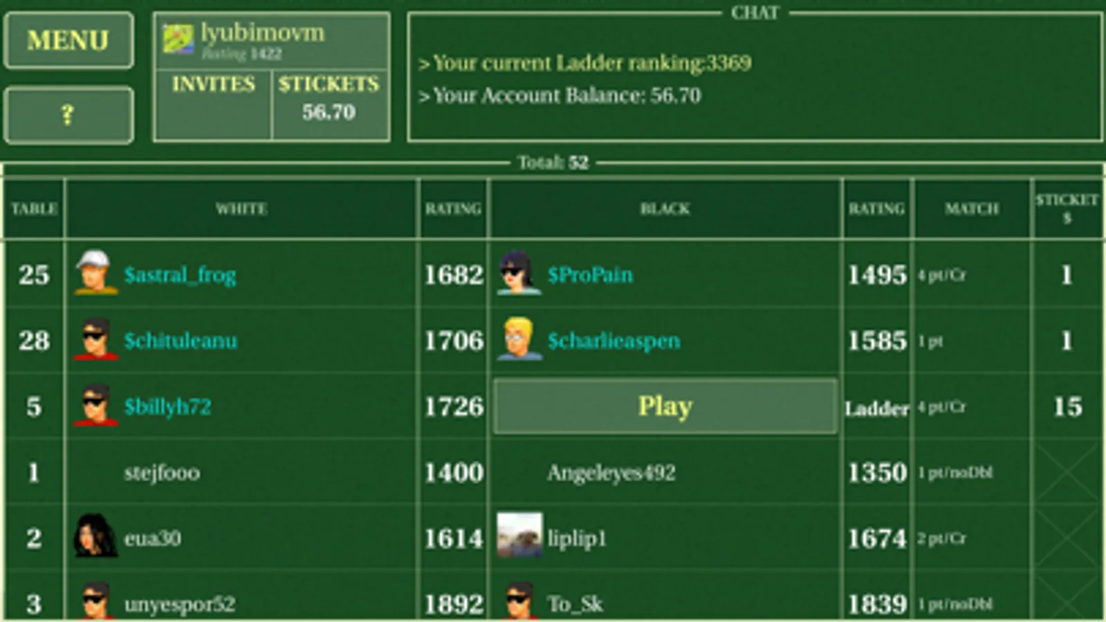 Play internet backgammon games or matches or tournaments, chat, compete, make new friends!