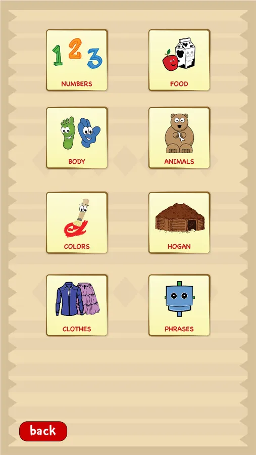 The use of the app will introduce children to basic Navajo vocabulary in categories such as numbers, food, colors, body parts, common sayings, and animals. Children can flip through the fun illustrated flash cards for a visual association of the word and listen to the audio pronunciation of each word to get familiar with how the word is spoken. Once a child becomes familiar with the words they can play a visual and audio game that will give them three fun illustrations to choose from and one word in Navajo to increase there memory of words and pronunciation. The game is random and kids can keep playing an increase their knowledge of the language.