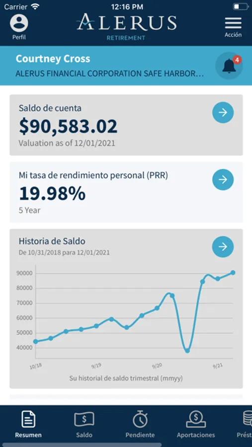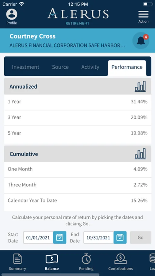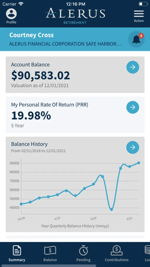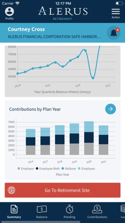 The Alerus Retirement mobile app allows participants of Alerus employer-sponsored plans to receive fast, free, and secure access to their account information. Access your account using your existing online username and password. Participants can receive important alerts, check balances, view investment performance graphs, and review contributions. The app allows for quick access to review investment information, monitor loan data (if applicable), see personal rates of return, and confirm contact details.