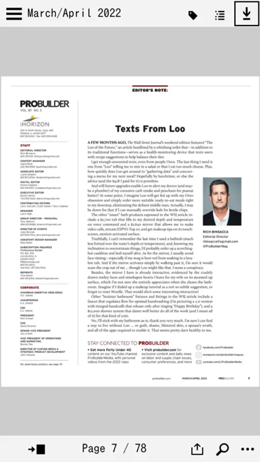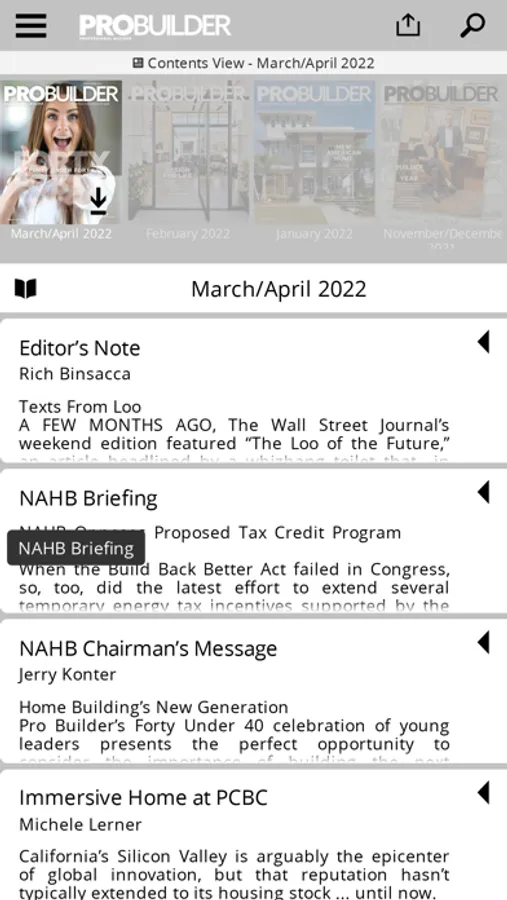 The Professional Builder Magazine app delivers all of the great monthly editorial content of this award-winning business publication. Read by more than 112,000 subscribers in print, the app edition of Professional Builder offers a dynamic new way to view and read the magazine. The PB app includes searching, live links to products, and easy-to-request of product information.