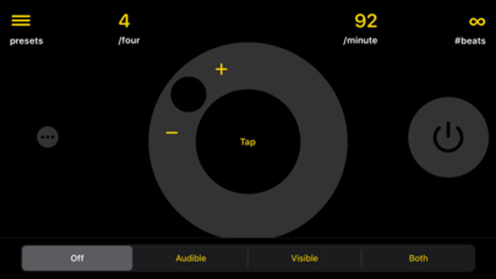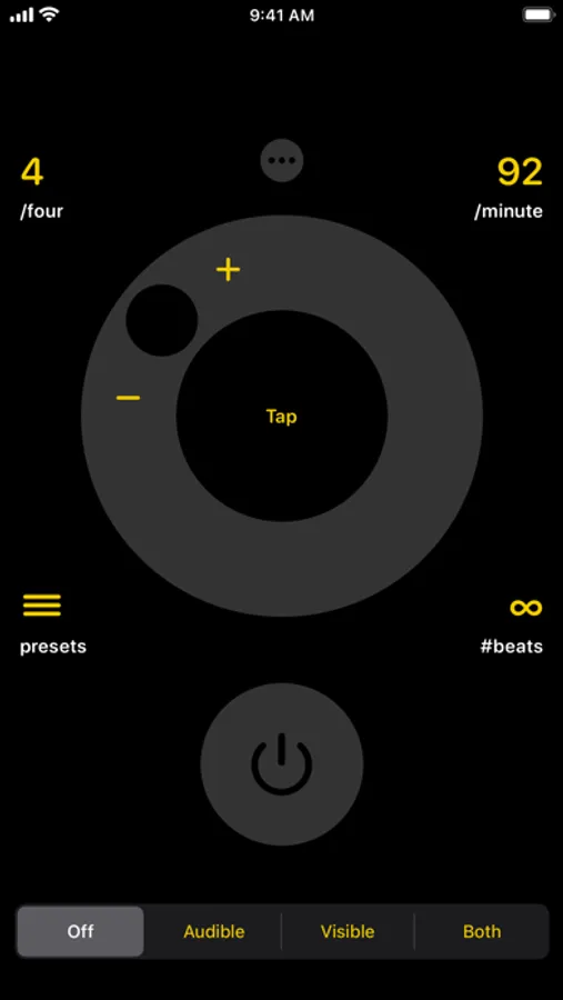 Use audible mode for a more traditional experience, use visual mode to see the timing instead, or use both for even more flexibility. Set the tempo by typing it in, using the adjustment dial, or by tapping twice in the center of the screen. Create and switch between as many presets as you like for quick access to your most frequently-used settings.