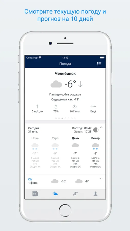 - смотреть текущую погоду и прогноз на ближайшие 10 дней;