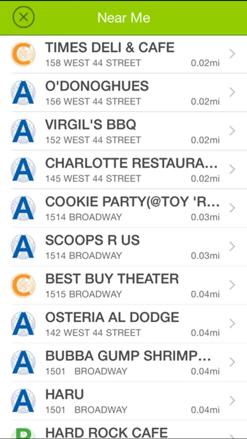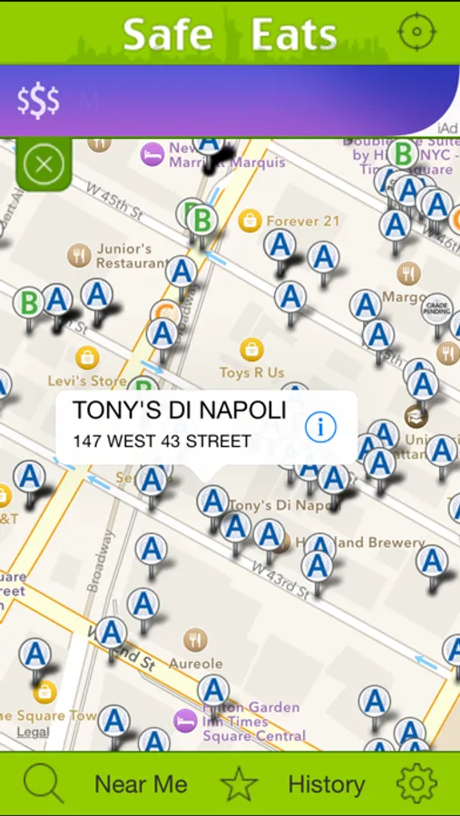 Using your device's Wifi signal, GPS, or cellular signal, Safe Eats NYC will pinpoint your location on the map and load nearby food establishment markers with their NYC Inspection Grade right on the map. The App uses your location, or the center location of the map, to determine the Zip Code and load appropriate markers nearby.