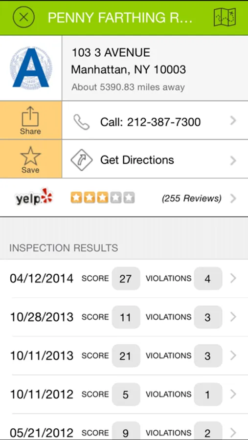 Scroll the map, move around, inch and zoom and the restaurant markers update… showing you the inspection grades nearby. Tap on a marker to view detailed information of the establishment, including All past inspections, logistical data, and even Yelp reviews and rankings.