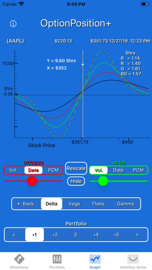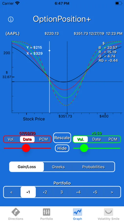 • graphically displays Gain/Loss, Delta, Vega, Theta or Gamma as a function of stock price: