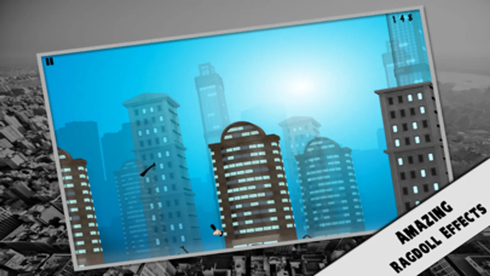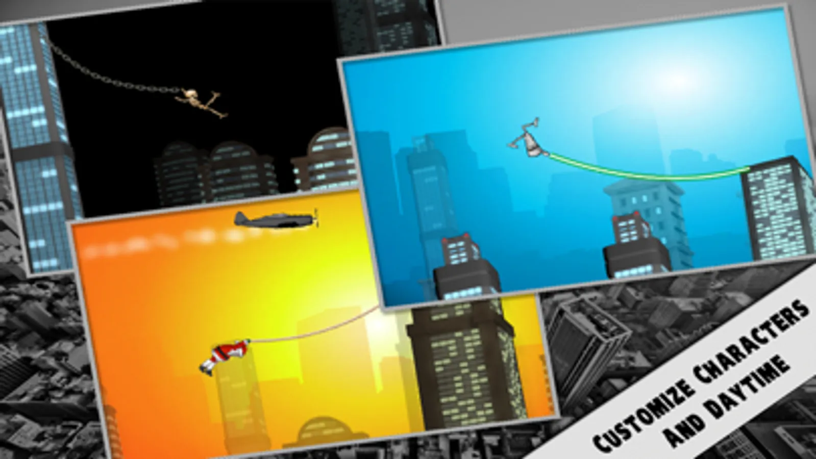 Use your ropes to swing a destructible ragdoll from one skyscraper to the others. You have full control over your ropes, touch on a building to throw your rope there, touch again to release it and fly through the sky. Perform various kind of jumps to get achievements, attach to flying planes or ballons and try to beat your friends or all other players by competing with them for the best score.