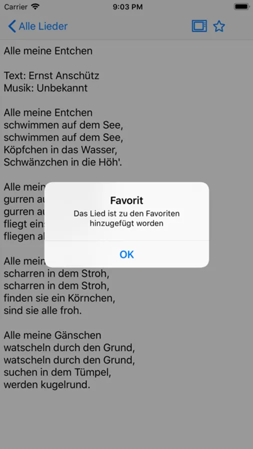 Alle Lieder sind auf einer Datenbank im Internet gespeichert, allerdings sind sie auch offline unter Favoriten verfügbar mit einem Tap auf den Stern