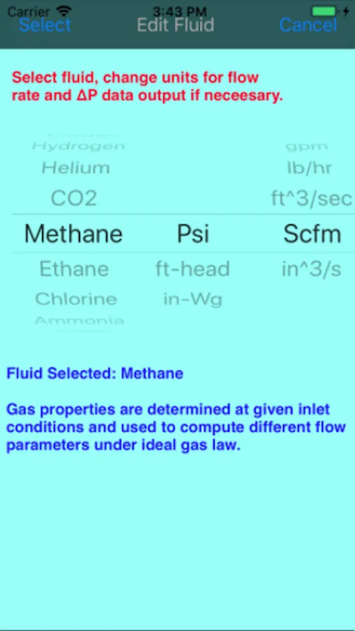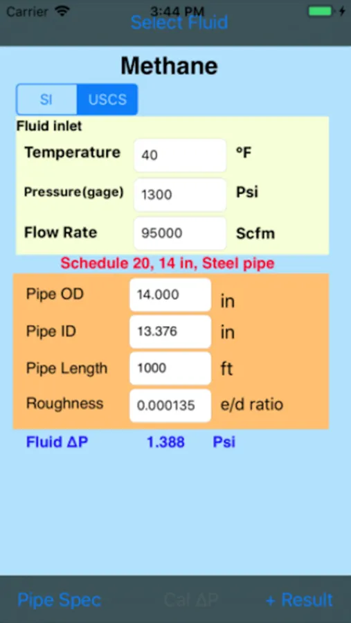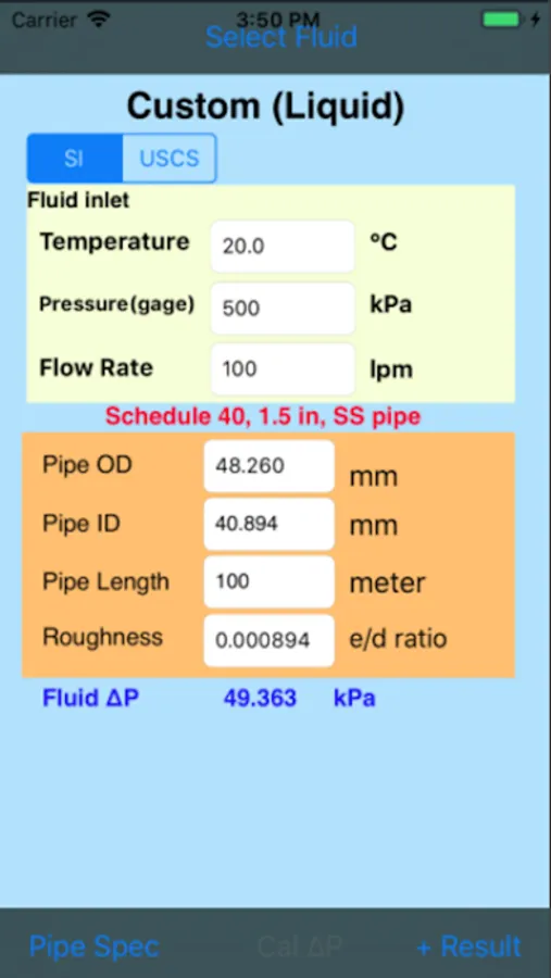 Users can choose different unit of measurement for both flow as well as pressure drop under given unit standard (SI or USCS). This can be conveniently selected while choosing the fluid from the picker list as shown in the screen shots.