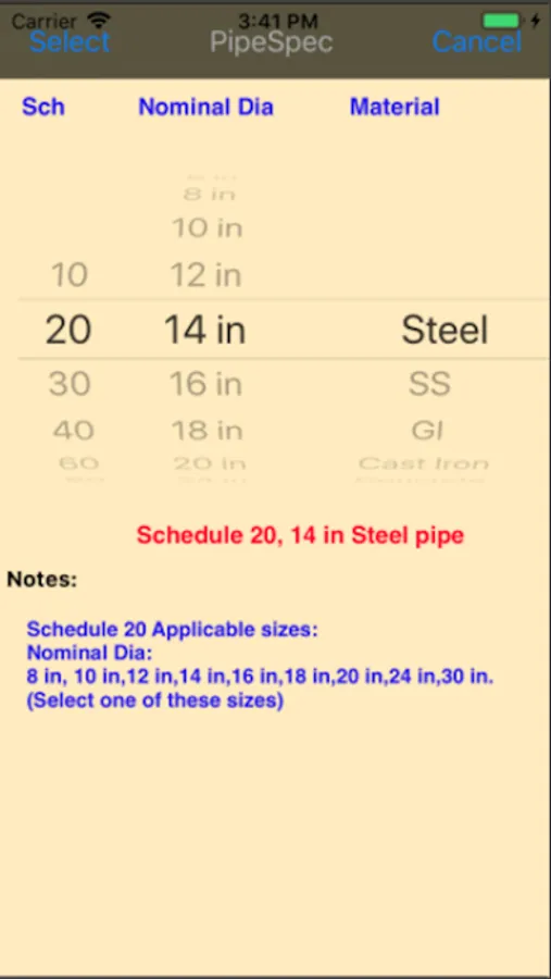 Users can pick applicable sizes under nominal diameter for which app provides the corresponding inside and outside diameter.