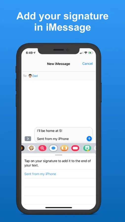 You can now access and append your signature from the Messages app! After composing a text message, open the SMS Signature iMessage app, tap the signature you want to use, and voilà, your signature has been added
