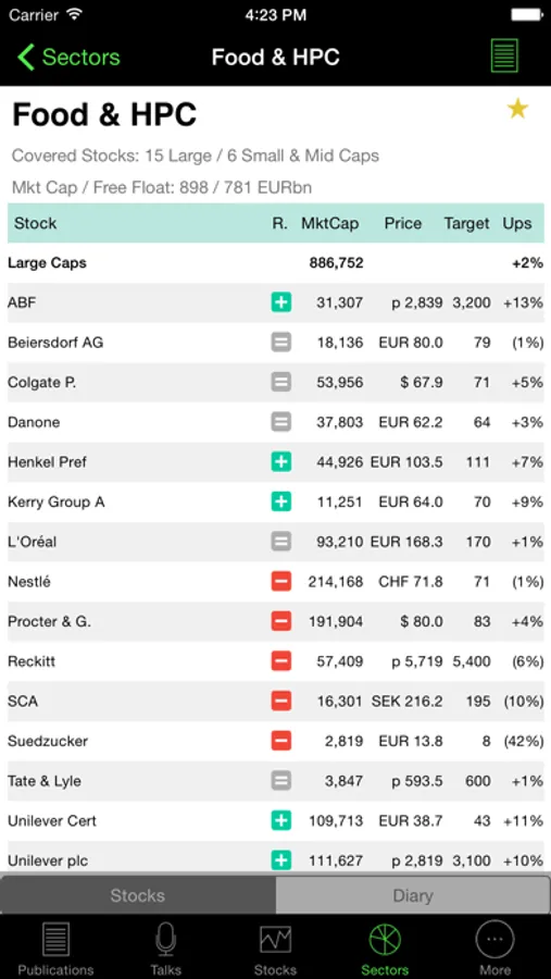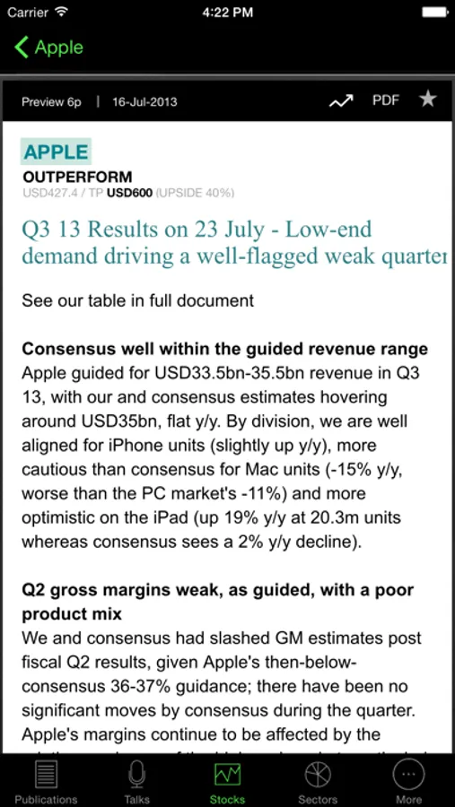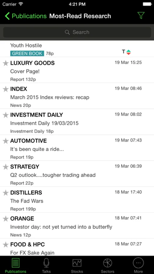- Simple and direct access to research product flow through thematic and customized feeds. These include: subscribed research, most-read reports, picks of the day, changes in recommendations, and publications by region, sector or stock