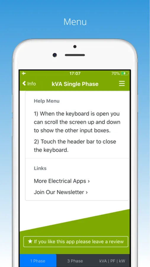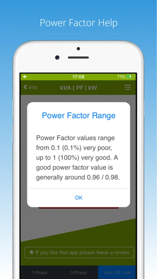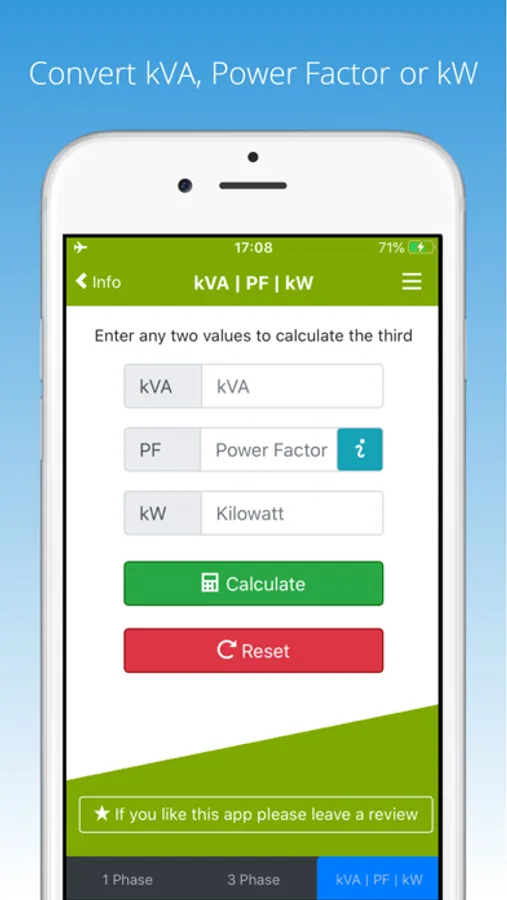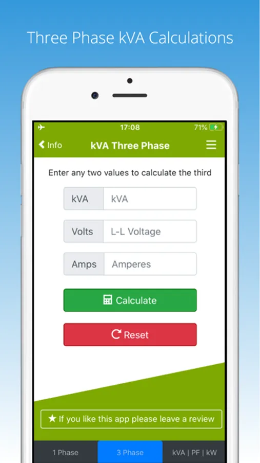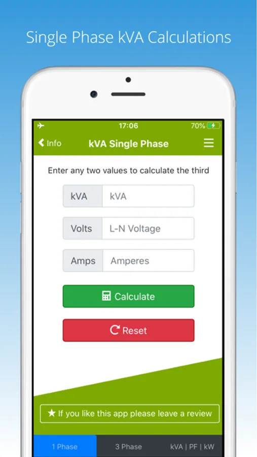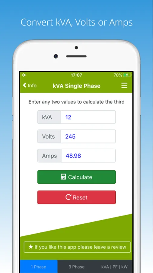 kVA Calculator App for iPhone and iPad. Calculate or convert to and from kVA, kW, Amps, Volts and Power Factor using the other known electrical values with single and three phase kVA calculations.