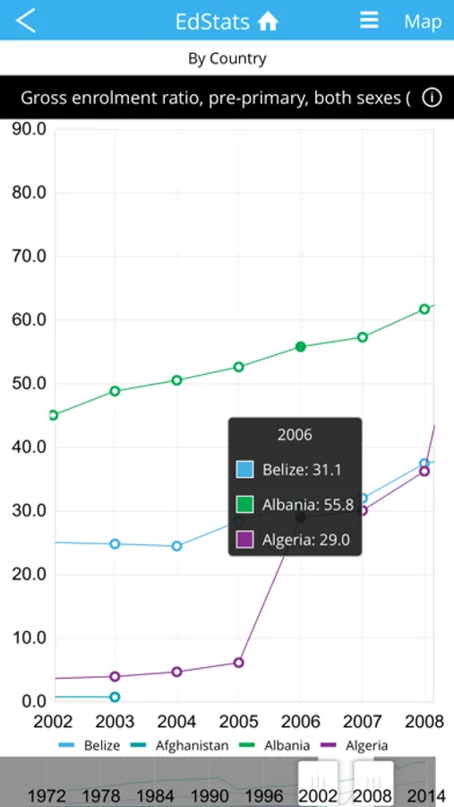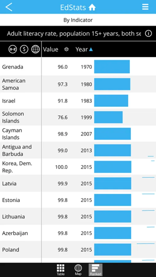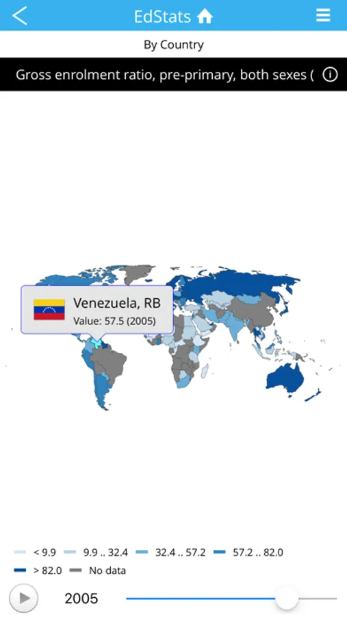 The World Bank EdStats DataFinder is an app for accessing national, regional, and global education data on topics like teachers, out-of-school children, expenditures, and learning. Indicators cover all levels of education from early childhood development to higher education, including policy data related to several areas of the education system (e.g. Teachers and School Finance). App users can conduct customized queries, view predefined queries, and access data by country, topic, or indicator. Data can be viewed in tables, charts or maps and easily shared through email or social media.