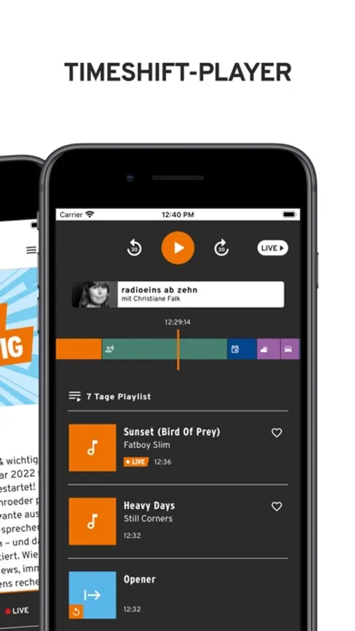 Vor allem aber haben wir jetzt einen Timeshift-Player, mit dem man die letzten vier Stunden radioeins nachhören kann! Entweder den Zeitstrahl nach links schieben oder eins der Elemente aus der Playlist antippen und schon können Sie das halb verpasste Interview oder den Song, der gar nicht so uninteressant klang, in voller Schönheit nachhören.