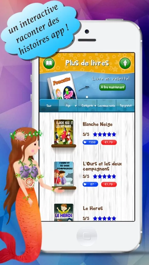 Bien qu'il existe de nombreux livres gratuits, les parents peuvent tÈlÈcharger des extraits avant d'acheter de nouveaux livres. Donnez ‡ chaque histoire une note. Verrouillez l'application aux heures de votre choix. Un mot de passe protËge l'application contre les achats non dÈsirÈs.
