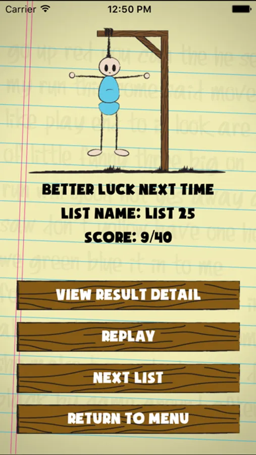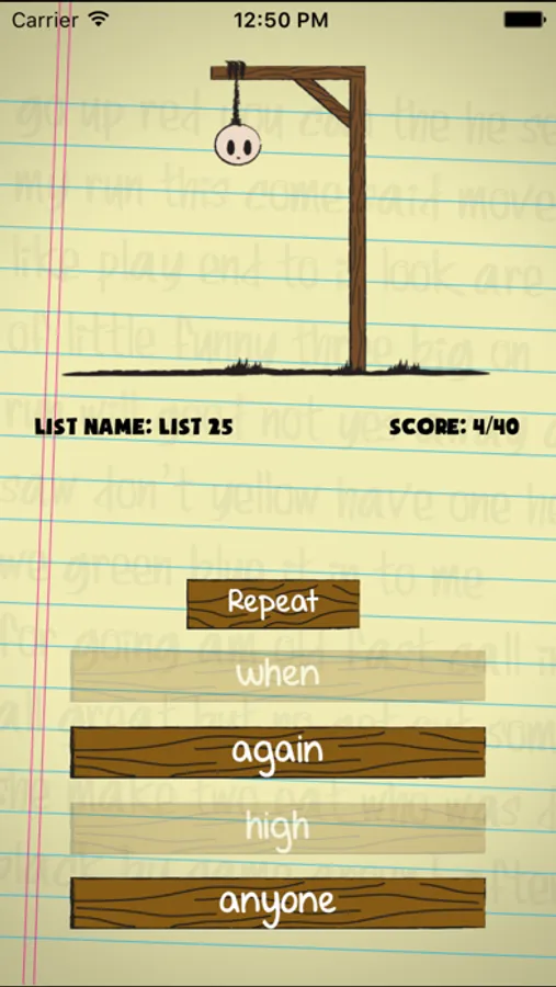 The game is simple, utilizing touch screen operations, colorful and comical graphics to persuade your child to play and learn. Sight Words Hangman begins by ”Selecting a List”, and touching the word “Repeat” to listen to the word. The child hears and views the word then makes their selection by pressing on the word that they think is correct. If the child chooses the correct sight word, then they automatically advance to the next word. If the child guesses the incorrect word, a body part of the hangman shows up on the screen and then the child is given 5 more opportunities to guess the correct answer. If the child would like to hear the sight word again, they can press the “repeat” button to hear the word again and pick another answer. The child can see their score at the end of the game so they can try to improve their score the next time.