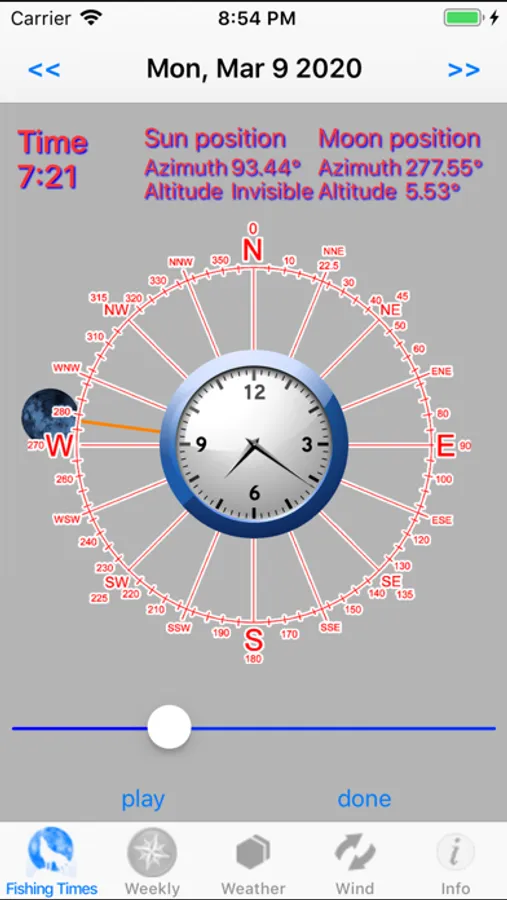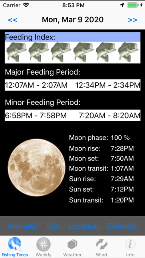 With a few taps of your finger, you'll see the best day of any week to go fishing, and the times of day the fish will be most active. If you prefer to check the data yourself, Best Fishing Times puts all of the information right at your fingertips, including moon phase, moon rise and moon set, major and minor activity periods for any day, and even includes a graphical sun and moon simulator!