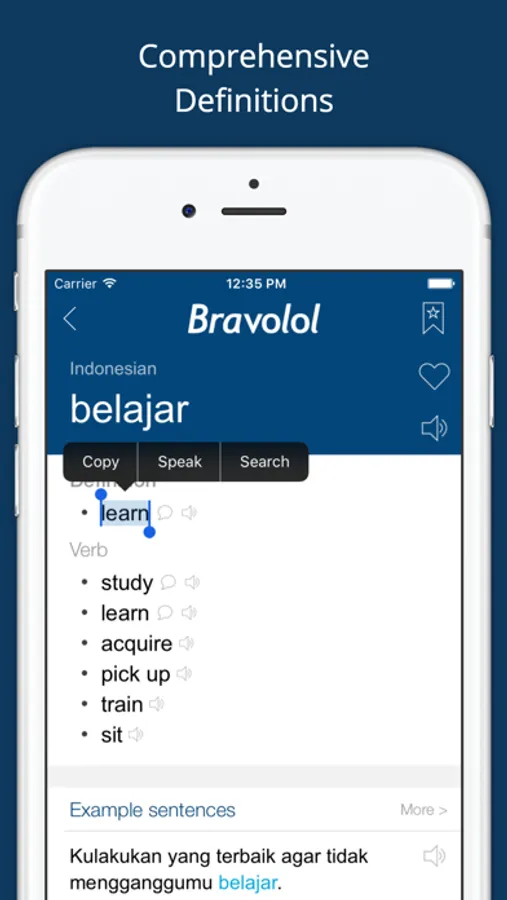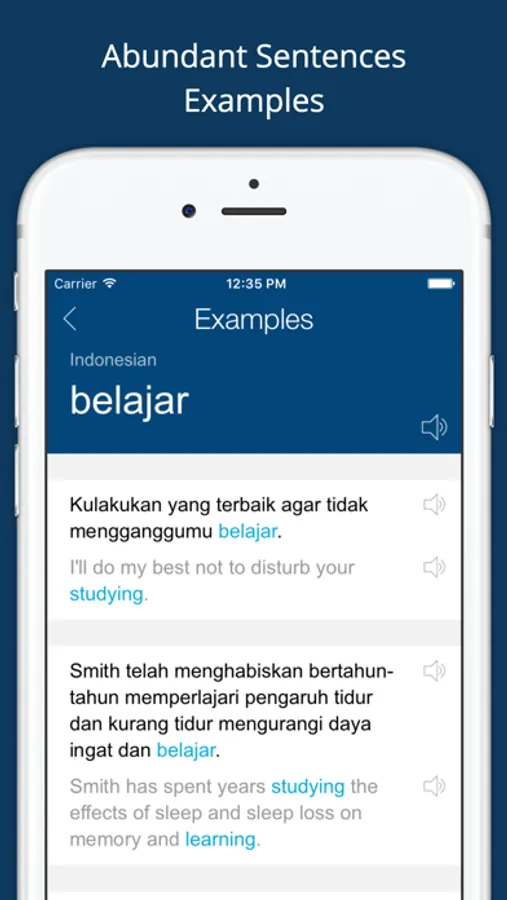 The Indonesian English Dictionary & Translator app enables you to search Indonesian & English words with definitions, examples, pronunciation, and more.