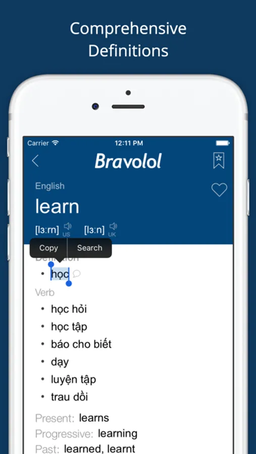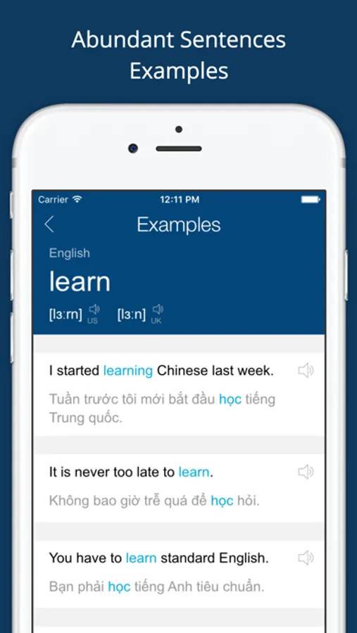 The Vietnamese English Dictionary & Translator app enables you to search Vietnamese & English words with definitions, examples, pronunciation, and more.