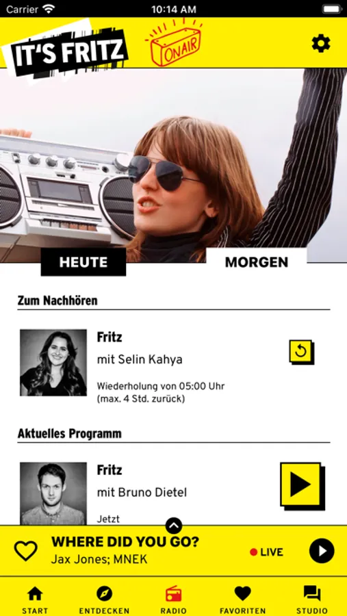 Mit der FritzApp könnt ihr uns im Livestream hören und uns ganz direkt Nachrichten ins Studio schicken. In der App erfahrt ihr außerdem, was gerade bei uns im Radio läuft und lief: von Titeln, Interpret:innen, Playlists, Sendungen, Moderator:innen bis zu aktuellen Fritz-Aktionen. Auf der Favoriten-Liste könnt ihr euch eure Lieblingstitel, Audios und Podcasts vormerken.
