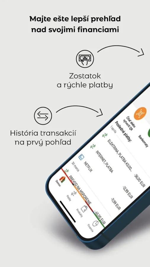- Prihlásenie a každý úkon potvrdzujete vami zvoleným unikátnym PIN kódom alebo pomocou odtlačku prsta, prípadne skenu tváre.
