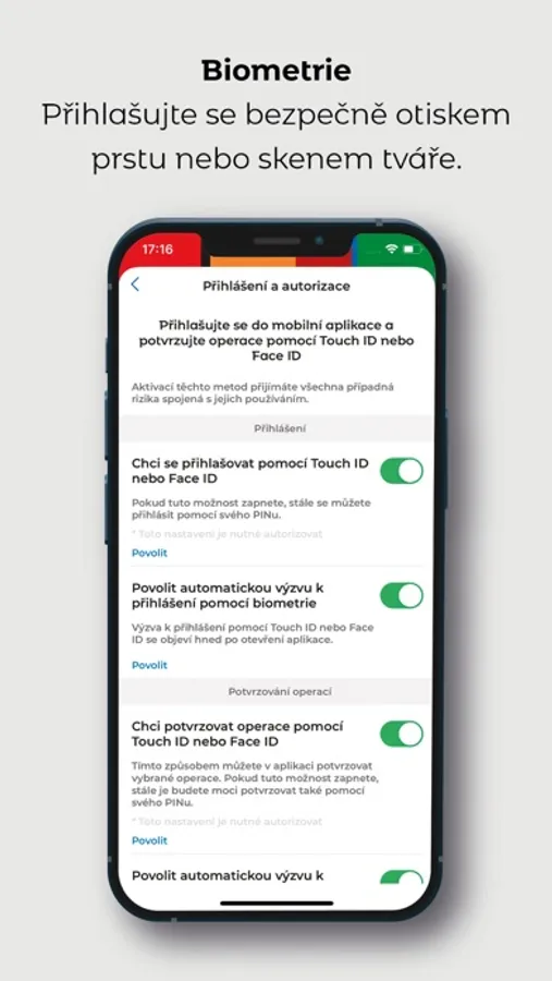 • Přihlášení a každý úkon vyžaduje vámi vybraný unikátní PIN nebo ověření pomocí otisku prstu, případně obličeje.